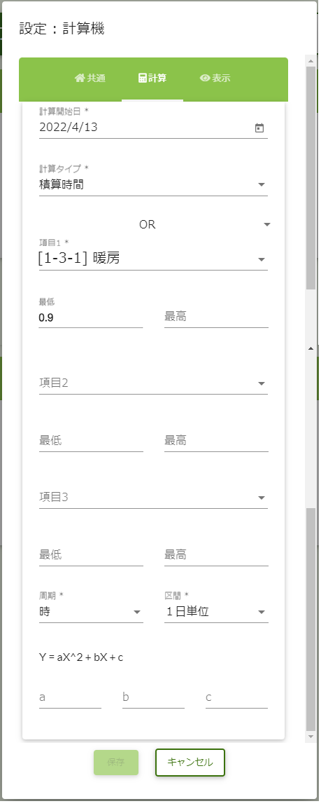 | 計算 | 周期 | 計算結果の時間単位です。 1秒ごと、1分ごと、1時間ごと、1日ごとの単位を選べます。表示単位ではないので注意して下さい。 |